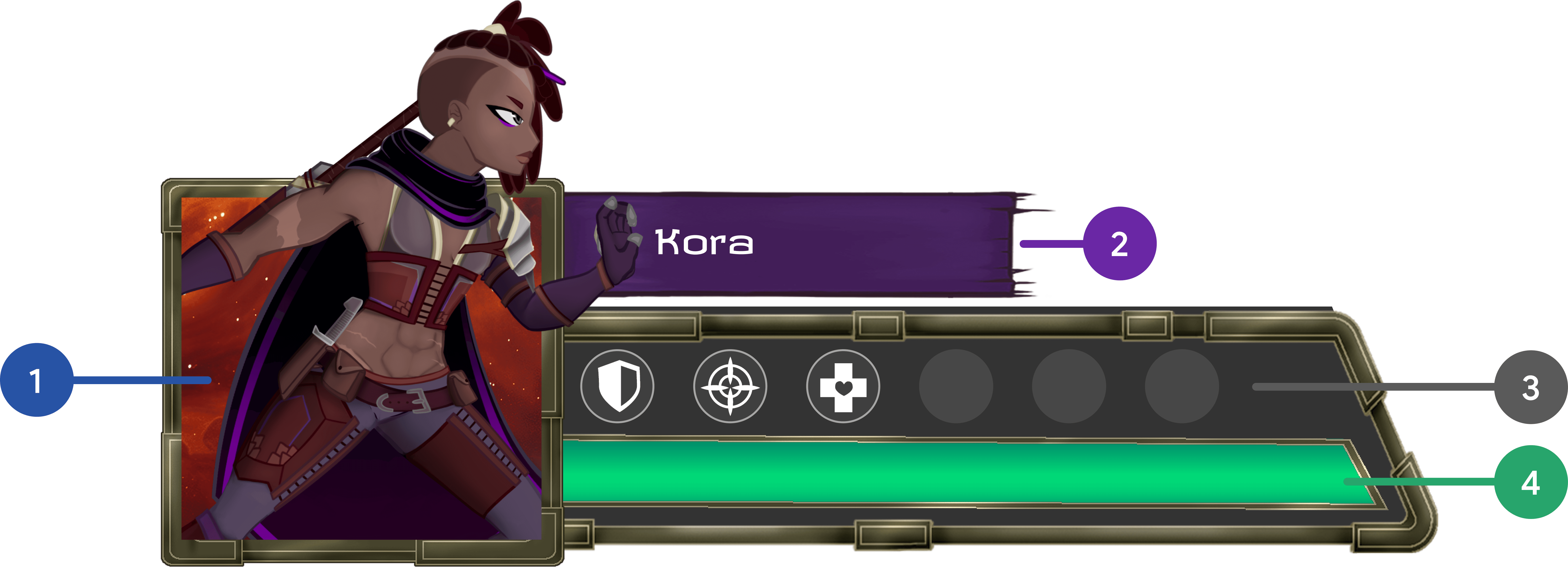 Shows key details of the active character including health, name and status effects for easy tracking.